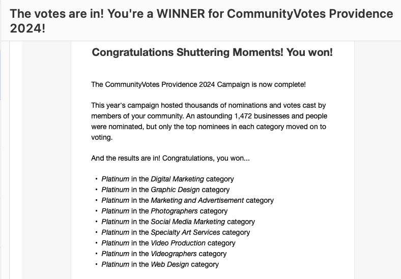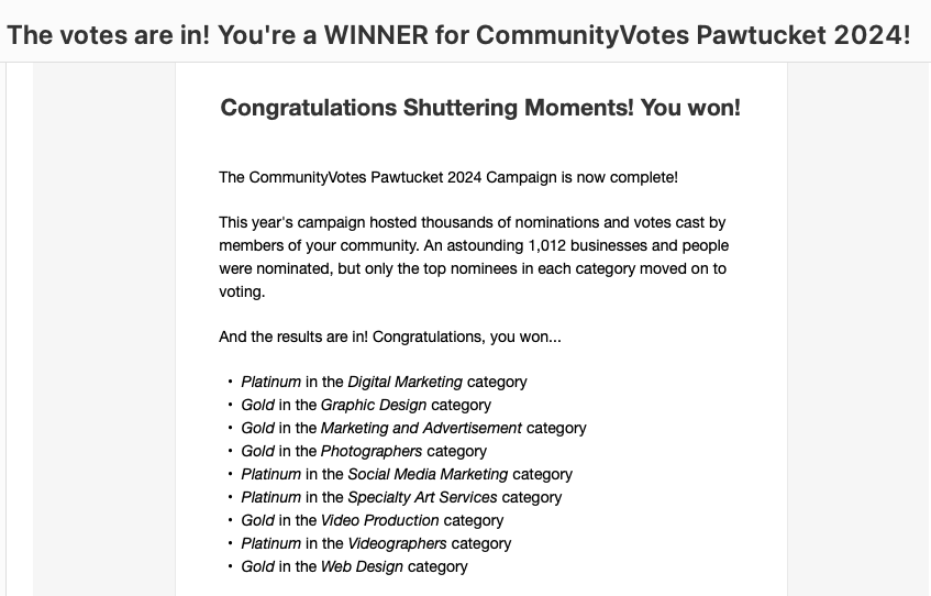 I am beyond grateful to share a milestone that reflects the heart and soul of Shuttering Moments Photography. This year, I was honored to receive 18 Community Choice Awards from both Pawtucket and Providence, recognizing the diverse services I’m fortunate enough to provide across Rhode Island and New England.