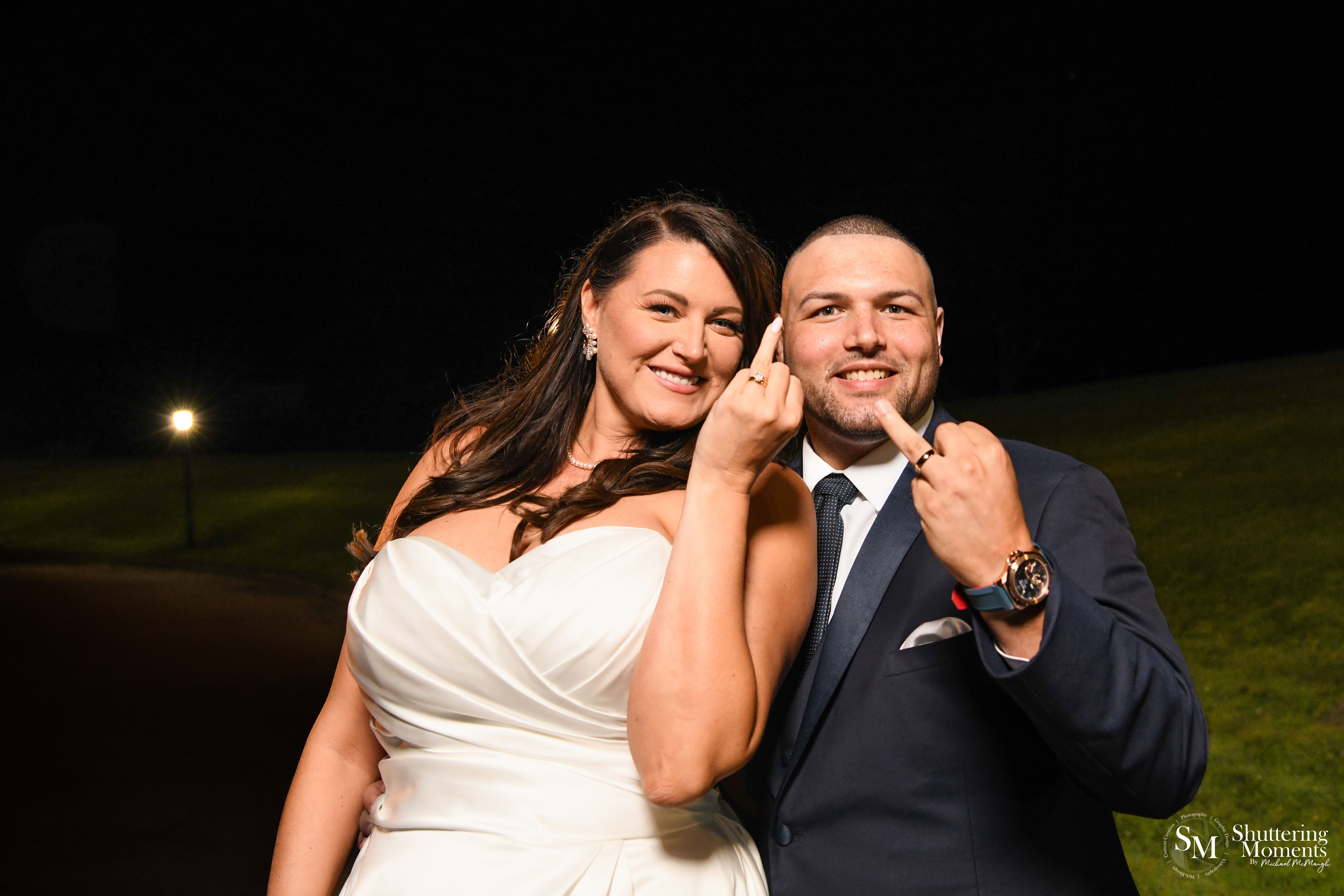 As the evening came to a close, the bride and groom were still brimming with joy. Their laughter echoed through the air as they posed for one final set of photos. They even shared a playful “signature look,” proudly displaying their wedding rings—a perfect end to their perfect day.