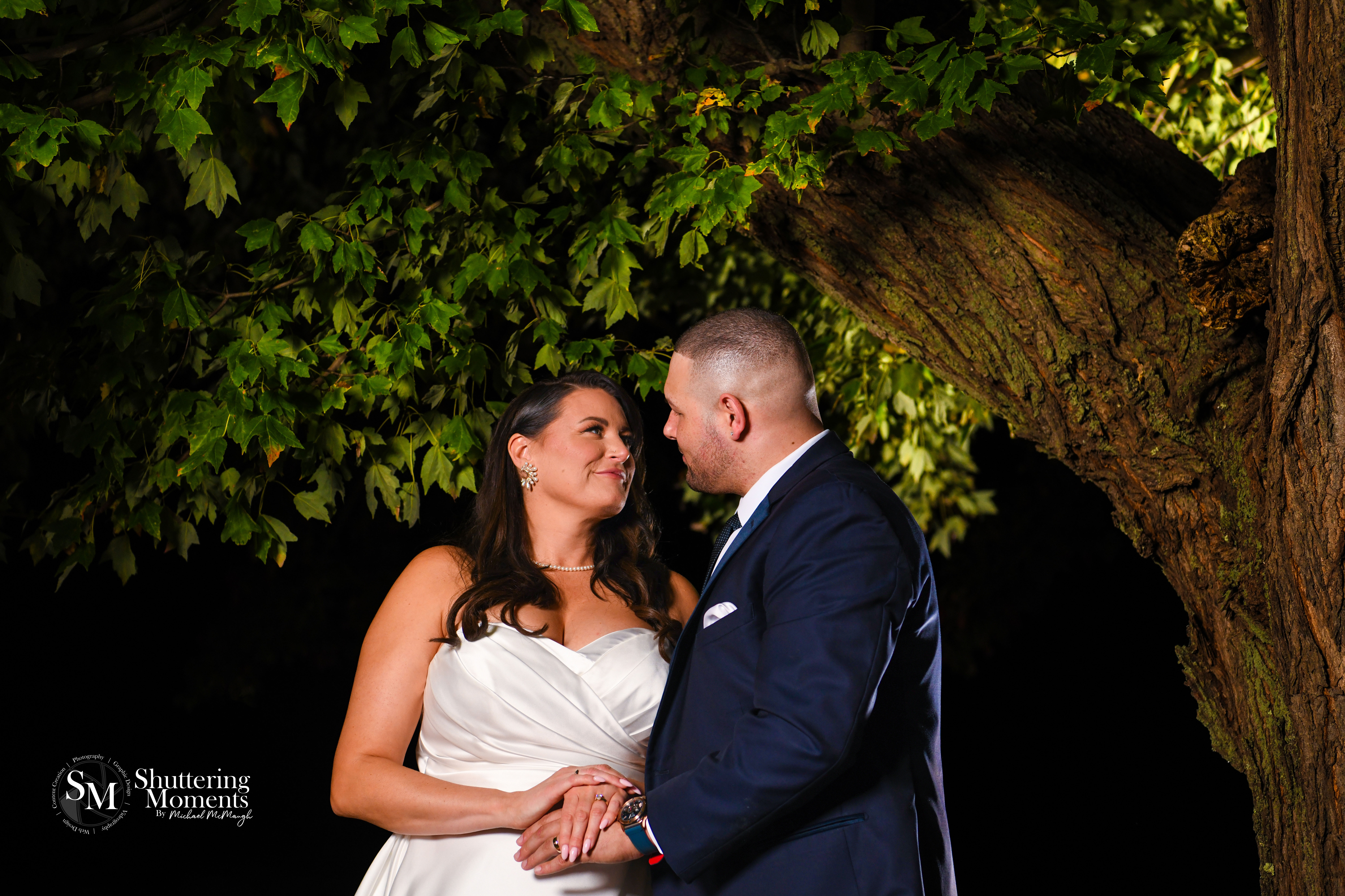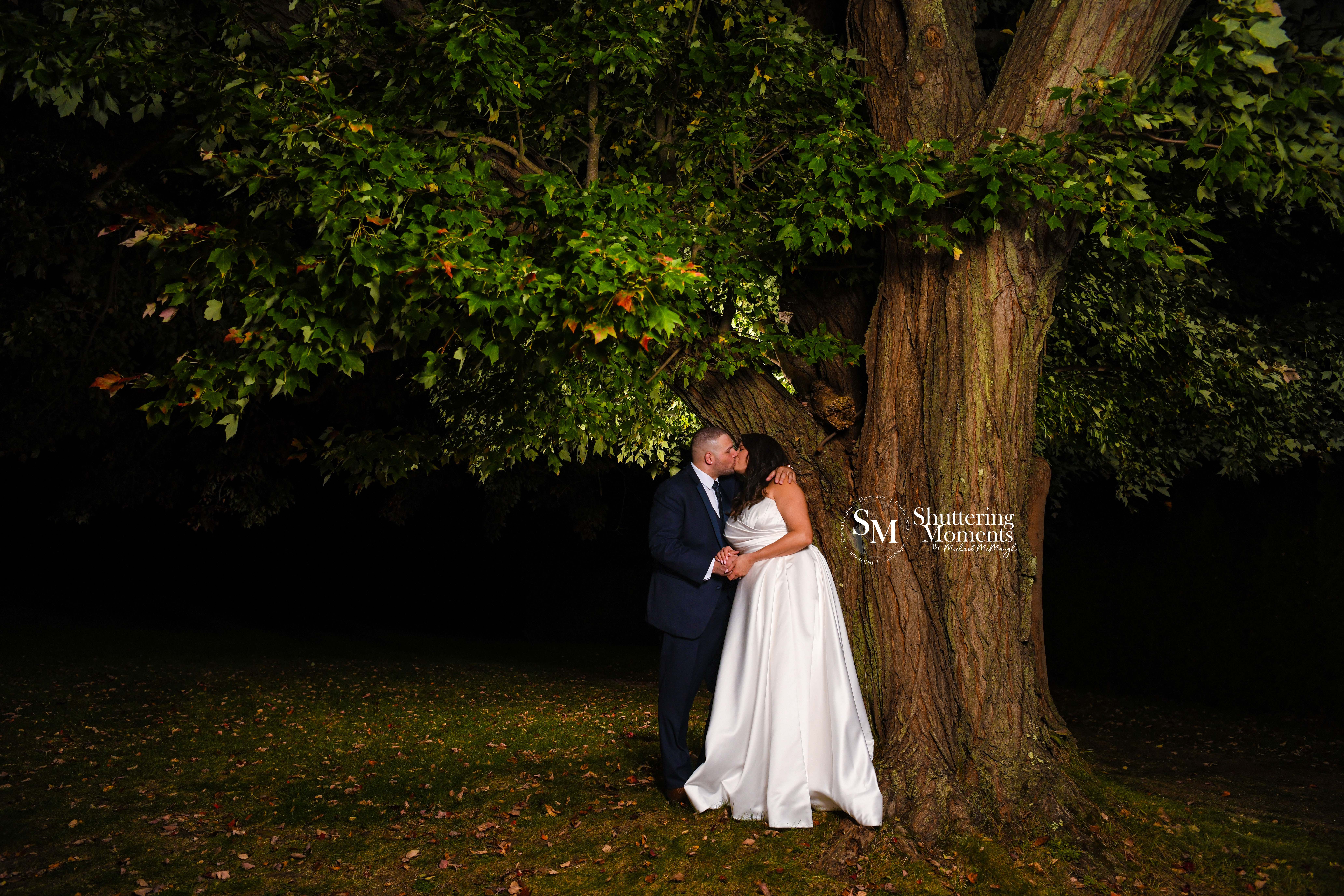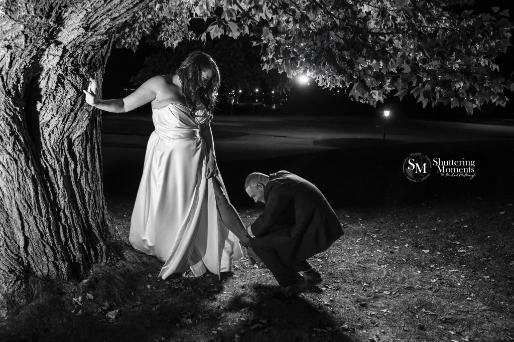 One of the highlights of the day was photographing the bride and groom during their formal portrait session near a picturesque tree on the property. The combination of natural sunlight and carefully placed lighting brought out the soft glow of the sunset, perfectly complementing the couple’s undeniable love for each other.